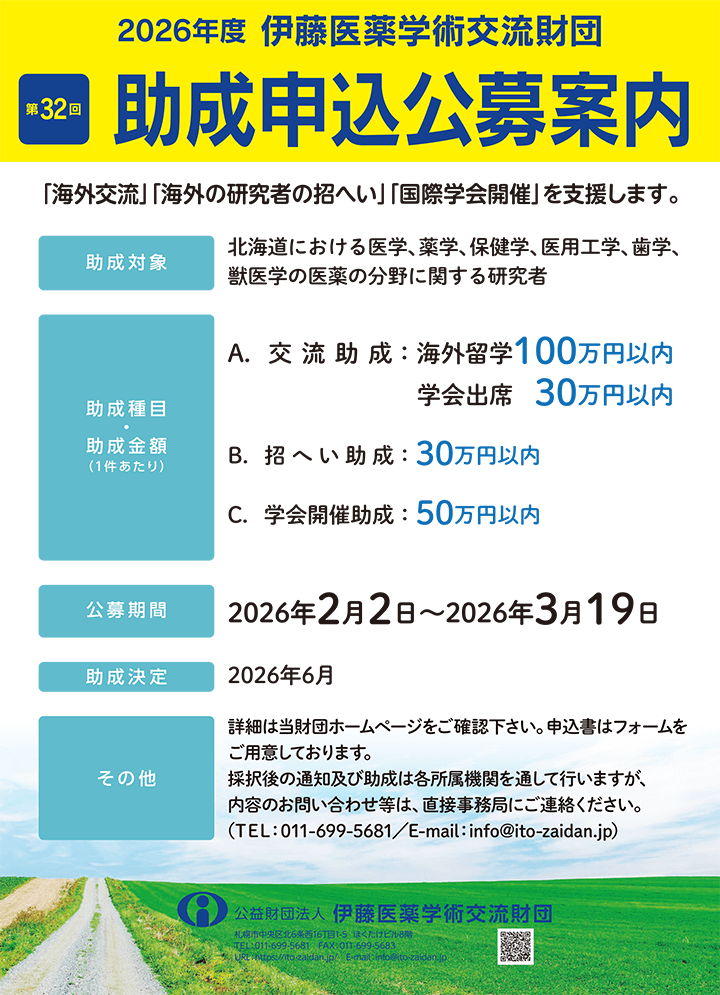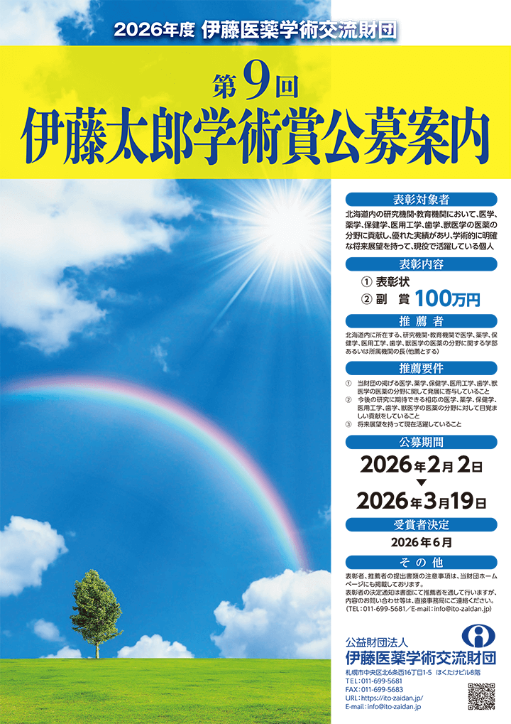 公益財団法人伊藤医薬学術交流財団2026年度の助成事業及び伊藤太郎学術賞の公募を開始いたしました。
